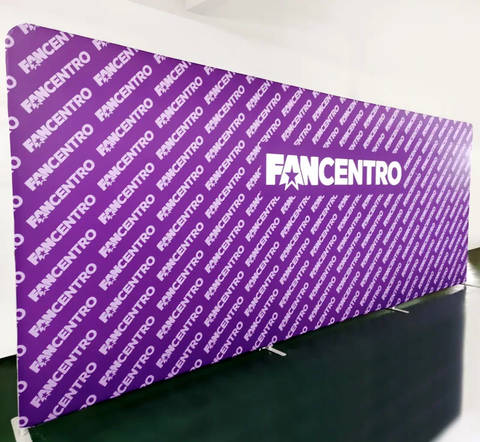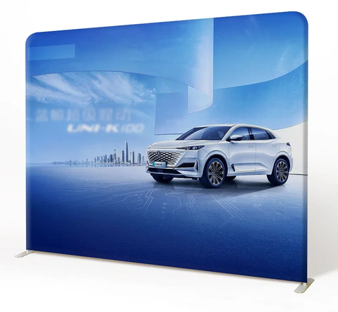 Support de toile de fond en tissu de tension imprimé sur mesure avec impression par transfert de chaleur et disponible pour une utilisation intérieure et extérieure.